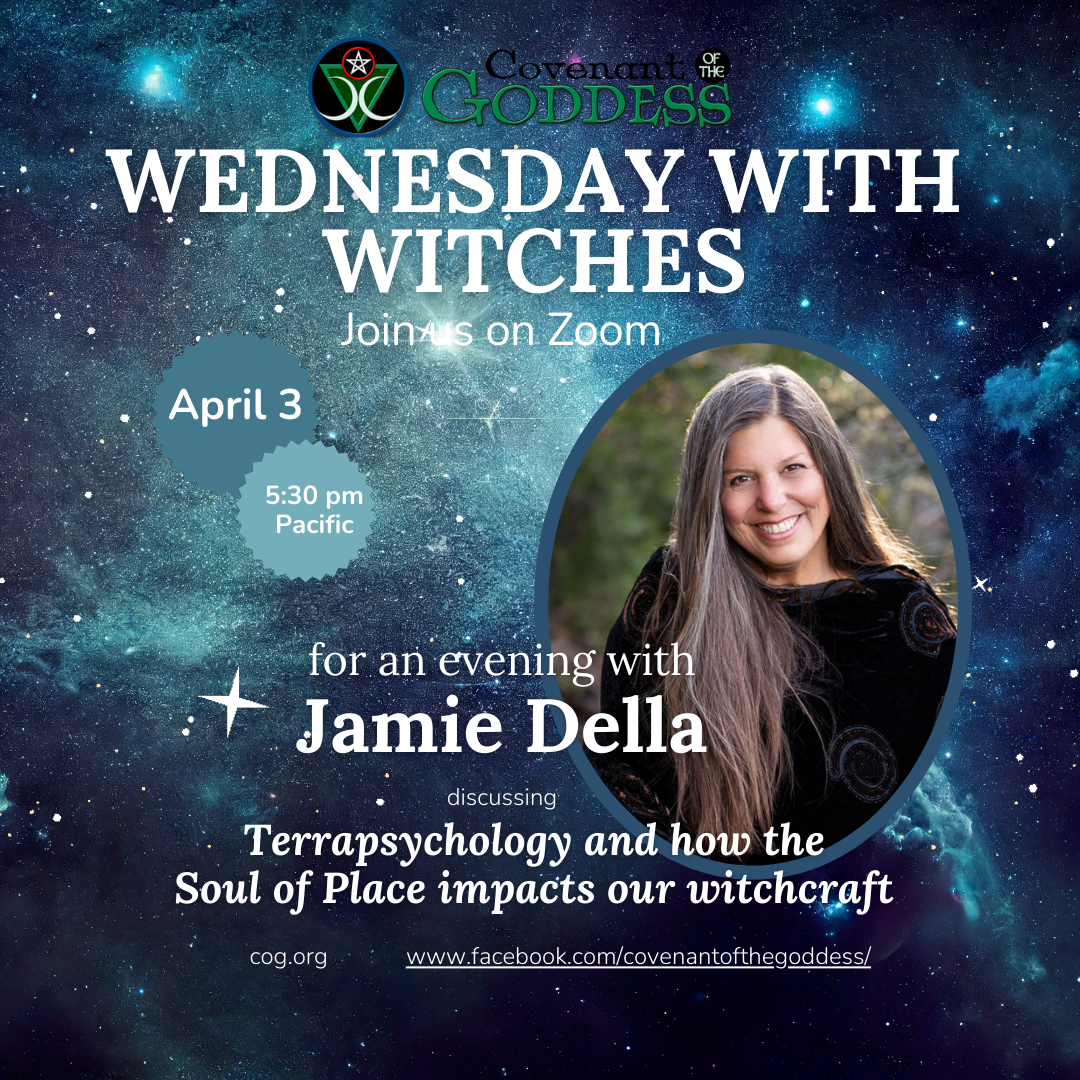 Join me for a free online workshop with the Covenant of the Goddess Wednesday with Witches. I will discuss how Terrapsychology, the study of the the aliveness of earth and her bodies of water, impacts your Witchcraft.